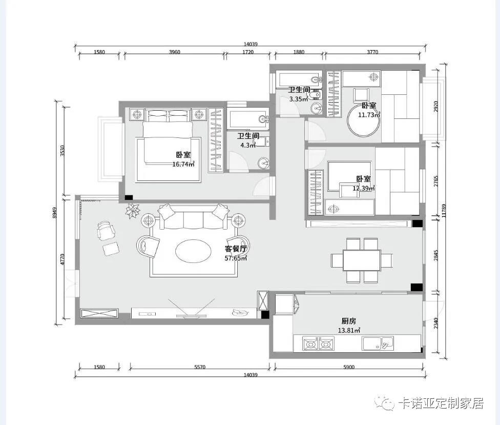 首先,将厨房扩大改成玻璃推门增加自然光,其次利用窄墙做对称式入墙多功能餐边柜,