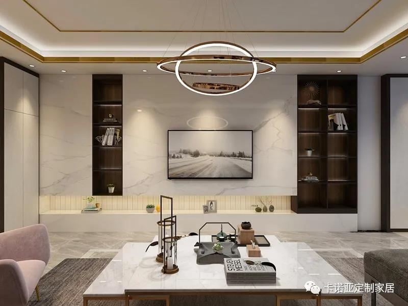 客厅选用偏北欧风的装饰元素,简约系汉白玉让墙面更加简洁大气。沙发靠枕和地毯等布艺品在白灰的大色调中,加入跳跃的粉红做点缀,活泼亮眼。开放格入墙式电视柜造型简洁,和一旁的黑色木门相互呼应。电视机下面的镂空设计,摆放艺术饰品,墙内灯带设计,让极简空间明亮而温暖