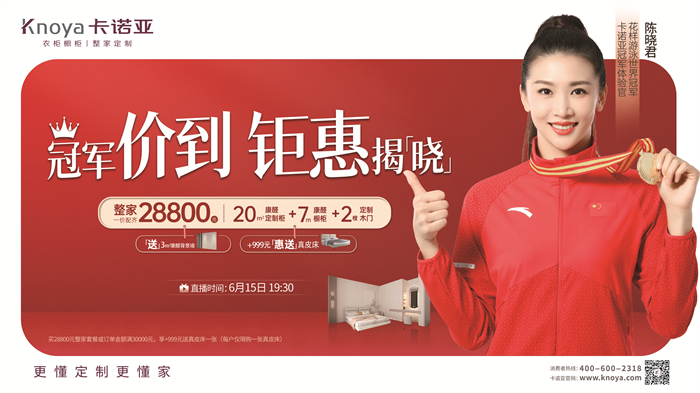 “冠军价到,钜惠揭「晓」”超级直播活动,将于6月15日19:30准时开播,卡诺亚将携手花样游泳世界冠军陈晓君,解锁高颜高品整家空间的新花样。作为卡诺亚冠军体验官,陈晓君将空降卡诺亚直播间,亲自带领粉丝们一同体验卡诺亚柜墙门一体的冠军品质,为大家狂派618家装福利,此外直播期间还有更多派礼、免单、抽奖活动等惊喜福利,精彩不止、宠粉不停,绝对不容错过!