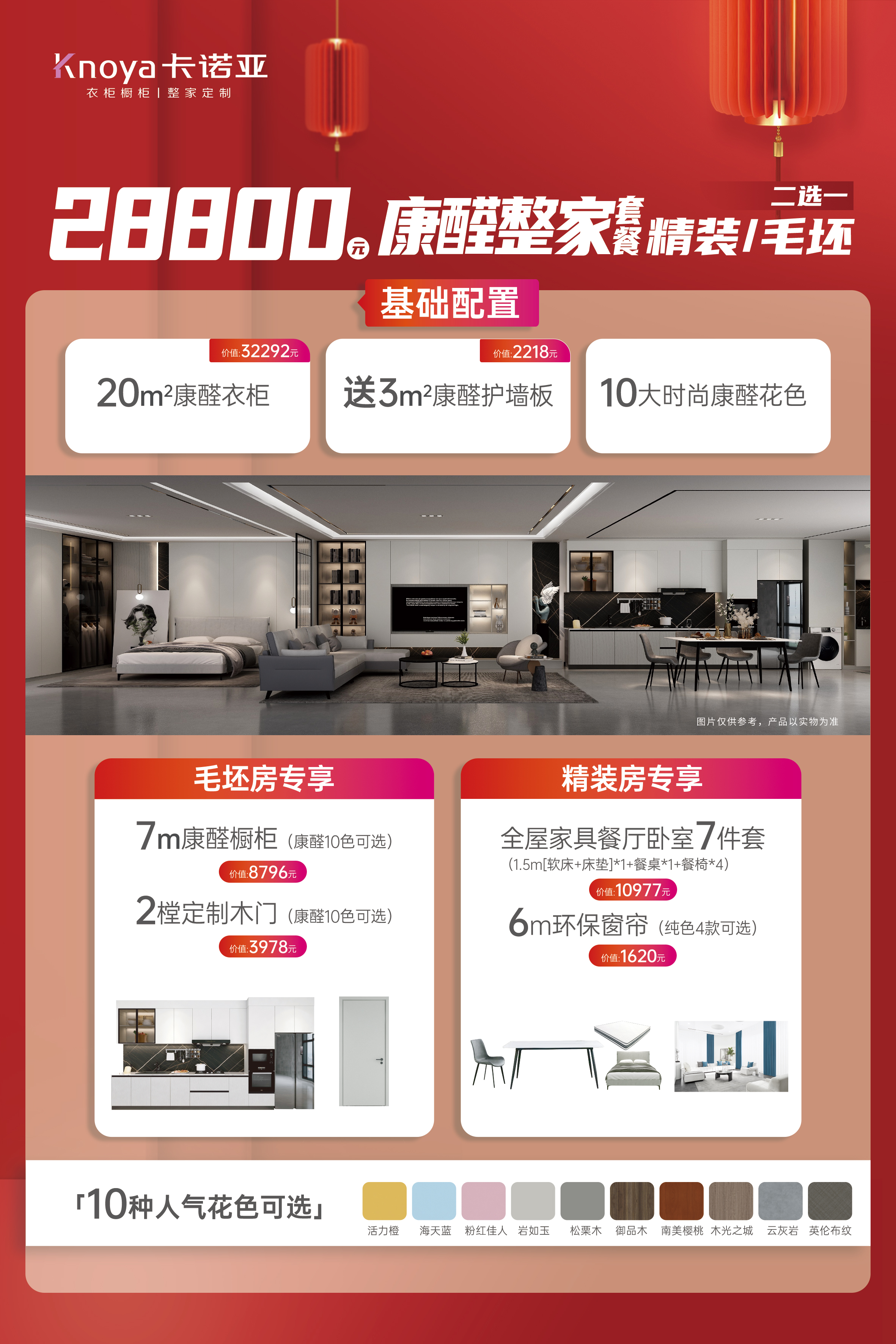 28800元康醛整家套餐=20㎡康醛app柜+7m康醛橱柜+2樘app木门(毛坯房)或20㎡康醛app柜+餐厅卧室7件套+6m窗帘(精装房),再送3㎡背景墙,体育标配康醛板,花色再次升级为10大人气花色,一个套餐就能将柜、墙、门等产品一站配齐,真正实现“一家搞定,拎包入住,省钱省心”。