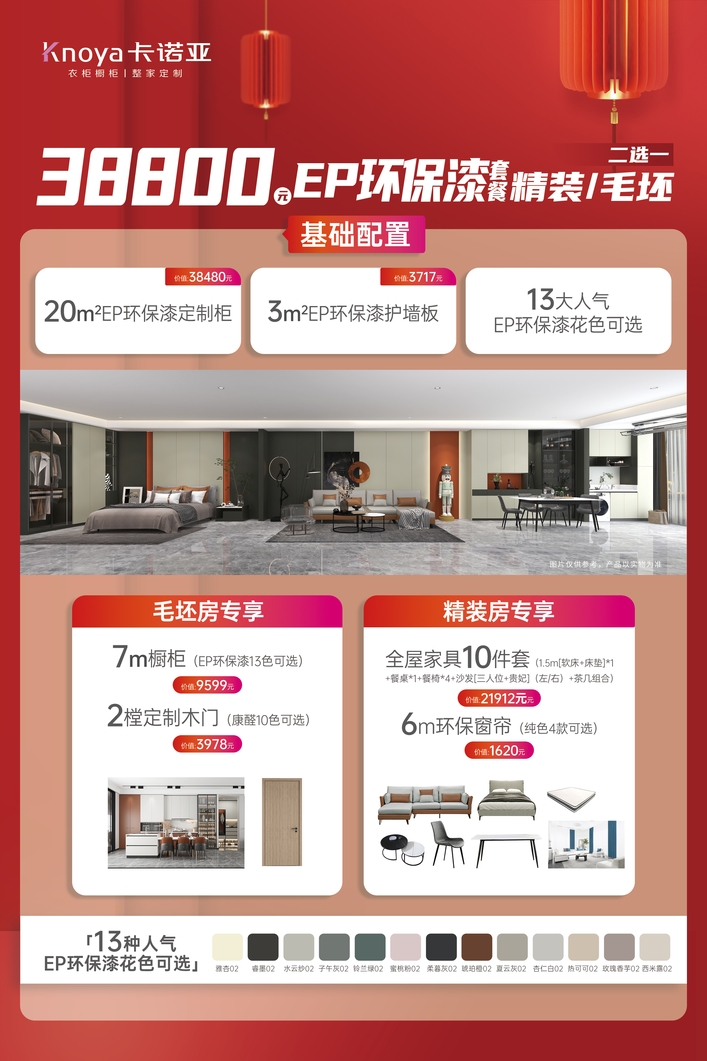 本次大促,除了一直在推出的28800元康醛整家套餐,还重磅推出了38800元EP环保漆整家套餐,分别针对毛坯房和精装房配置了不同的套餐内容,买套餐再送3㎡背景墙,并且将柜墙门一体化理念贯穿到整家套餐之中,让消费者买得实惠、装得省心、住得舒适!