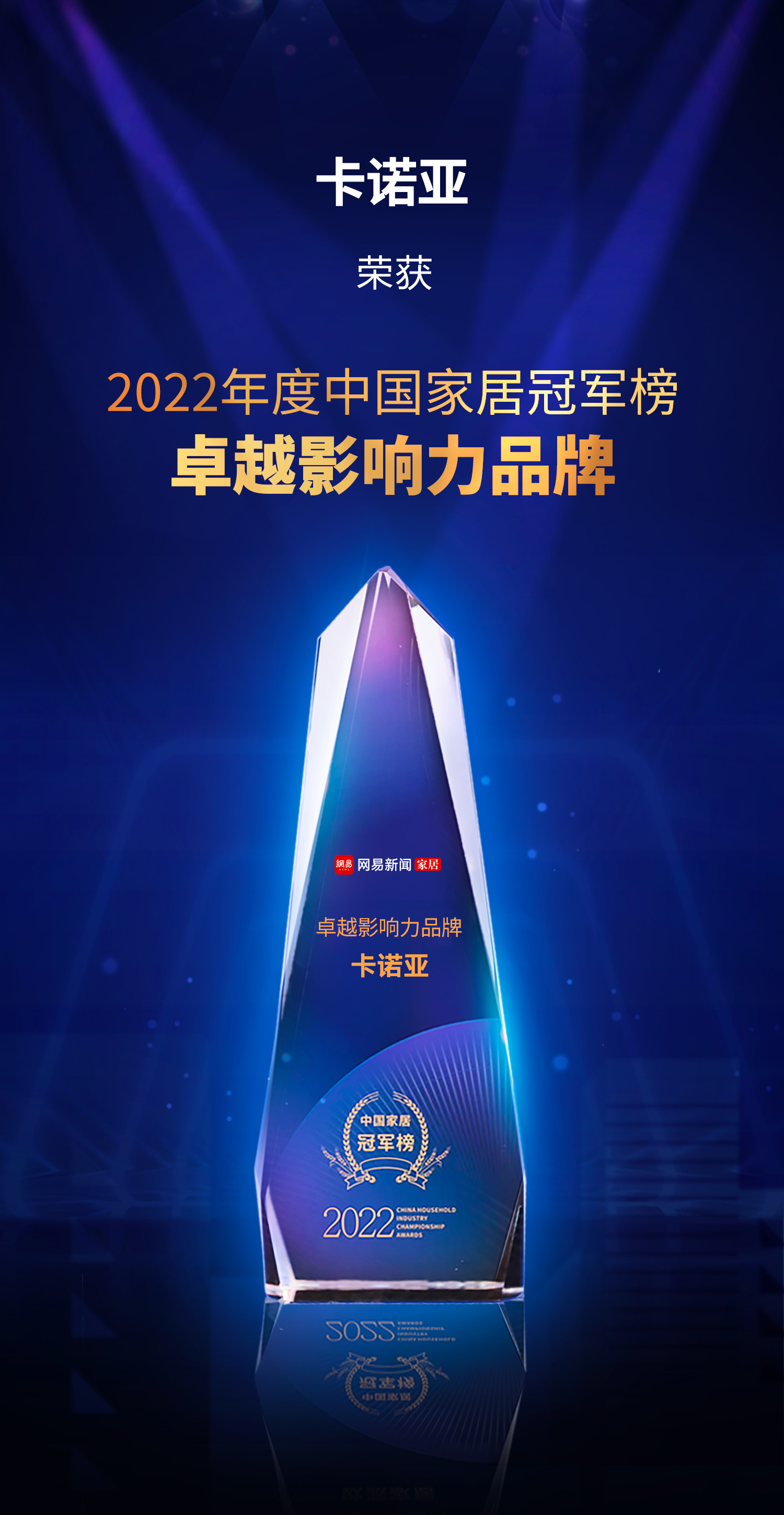 2022网易中国家居冠军榜,旨在对本年度中国家居产业有着卓越成就和杰出贡献的家居品牌和人物予以表彰,遴选行业有态度的实力榜样,激发优秀品牌和人物的引领作用,推动行业健康蓬勃发展。本次盛典发布2022年度中国家居冠军榜“卓越影响力品牌”、“年度领军人物”等十大重磅奖项,甄选行业优秀标杆,见证行业冠军能量。卡诺亚作为家居行业的佼佼者,众望所归获得“卓越影响力品牌”、“年度领军人物”双奖,持续引领行业高质量前行。