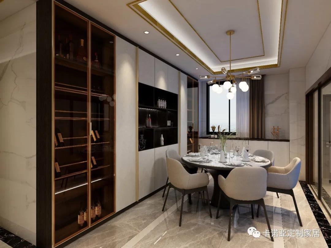首先,将厨房扩大改成玻璃推门增加自然光,其次利用窄墙做对称式入墙多功能餐边柜,
