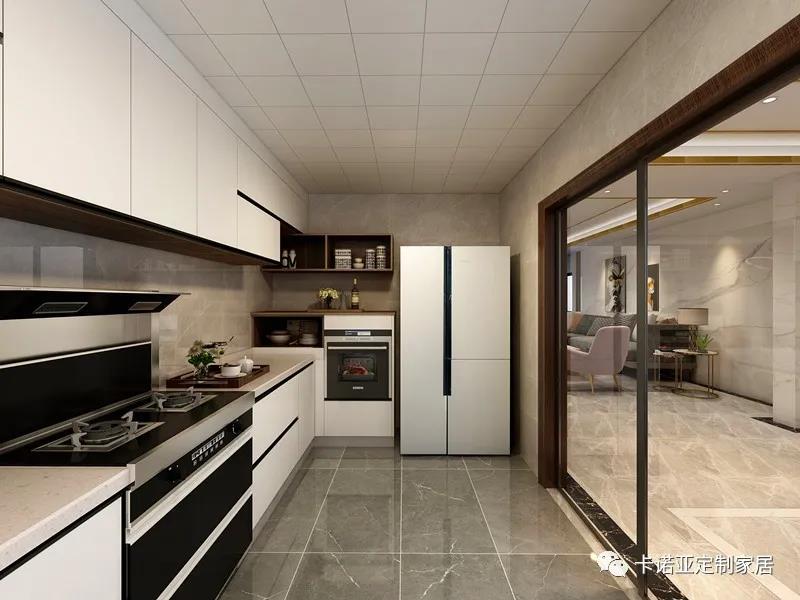 厨房与餐厅相连,中间采用玻璃推拉门隔开,