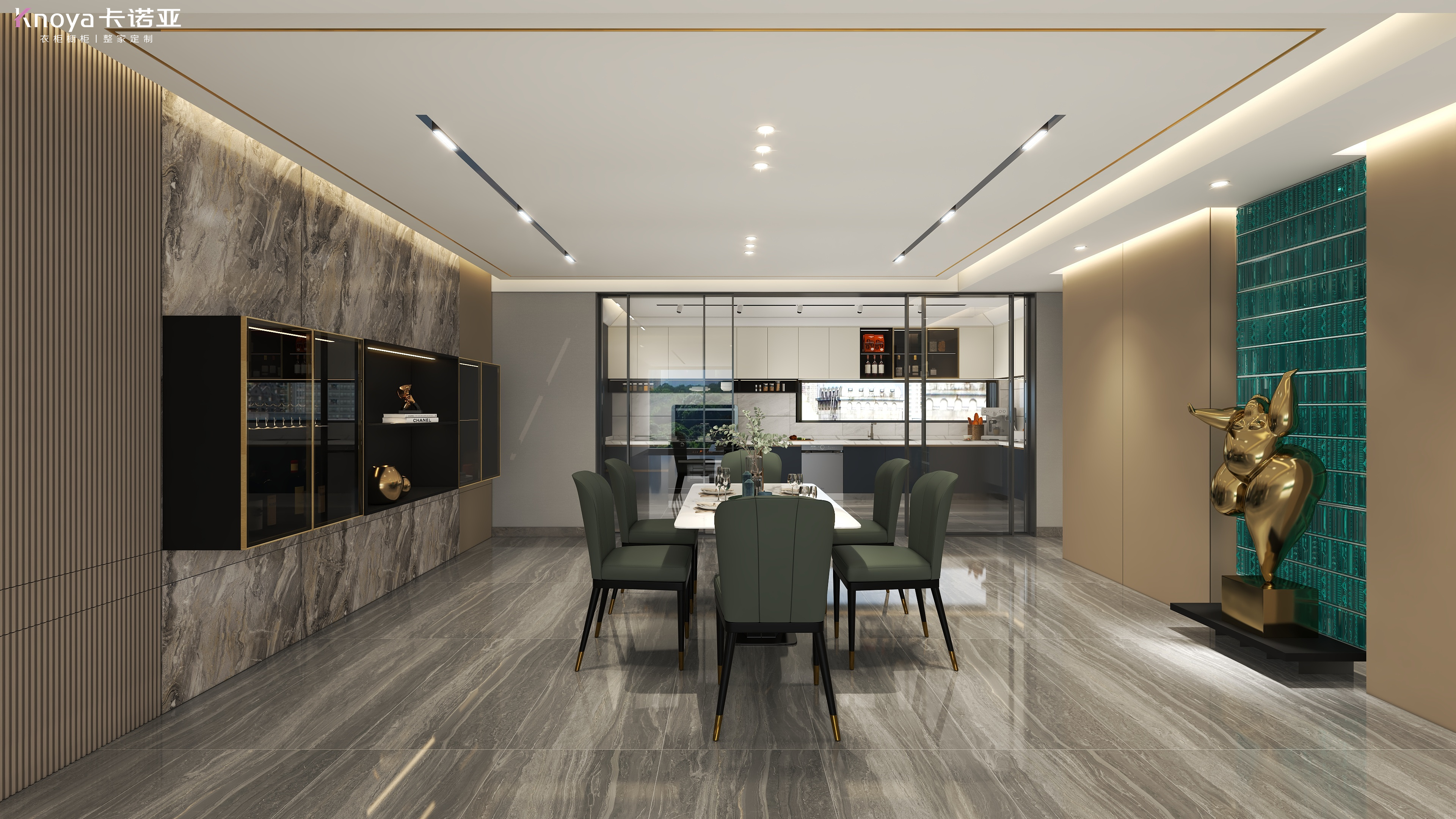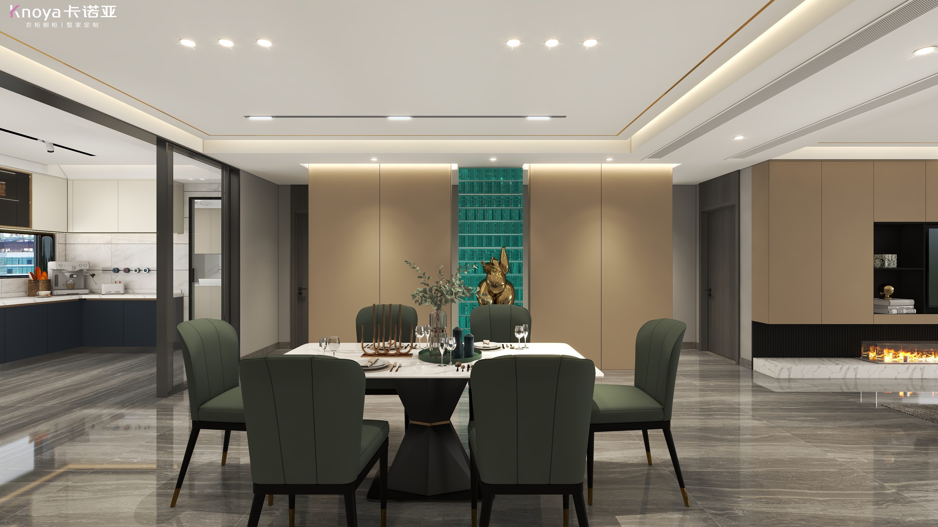 餐厅与厨房之间用透明玻璃门作为隔断,既能有效阻隔油烟,呈现的视觉也更加通透明亮;餐厅墙上悬浮式餐边柜,轻盈收纳,美观精致。
