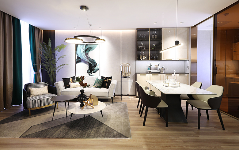 空间花色以石尚和格调白为主,C型电视柜兼顾展示和储物,局部留空,让空间有呼吸感;柔软舒适的布艺沙发,诠释着慵懒生活的完美奥义。一副泼墨挂画,让客厅顿时灵动起来。