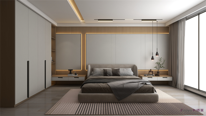 5、主卧:床侧衣柜对称式设计,玻璃门与封闭柜门的虚实结合,中间开放格过渡,具备挂衣、叠放、收纳、展示等功能。床头背景墙双色拼接,凹凸的格栅板与起伏的几何波纹“陶尔米纳”遥相呼应,视觉立体,触觉细腻。落地飘窗处的地台,高级之余多了一个休闲区。