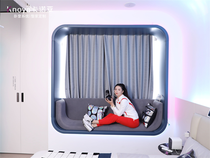 进入“乐在卧室”系列产品时,陈晓君禁不住坐在了卡诺亚专为活力青年设计的太空舱飘窗上,打开缤纷极光灯时,整个空间充满了未来的科幻感,仿佛置身极地的星空下,美轮美奂,让人充满遐想。针对年轻人喜爱的潮流手办,专门打造的展示柜,让心爱的“它”有了归属。看到可升降电竞桌,我们的体育明星也童心未泯,忍不住坐到电竞椅上,敲打键盘,点击鼠标,准备开黑呢!更让陈晓君惊奇的是,这里还有一个隐藏式投影屏幕,躺在床上就可以看电影、看动漫,搭配床头投影出水波纹的蓝光,在场的人都沉浸在对浩瀚星际的幻想中。