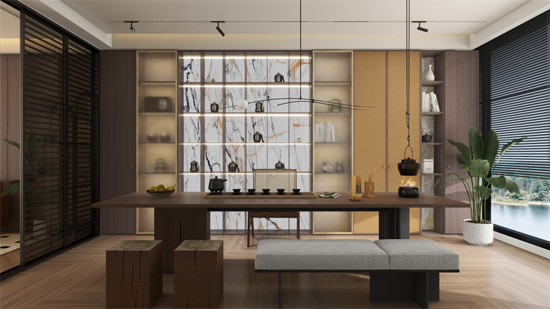 在清浅时光里,一手烟火一手诗意,任窗外花开花落,云来云往,自是余味无尽,万般惬意。茶室以素色调为主,深色的天然纹理厚实而流畅,打造质朴的空间,带来的不仅仅是原始的茶味,更是一种随性的洒脱意境。