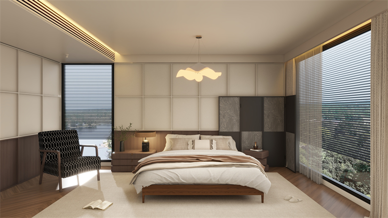温润柔和的卧室空间,捕捉记忆与情感的诗意,陈述着过去与未来的情愫。床头背景墙采用凹凸有致、细腻流畅的骨骼线与拼色护墙板,让空间呈现多维立体的艺术美。落地窗让阳光洒进来,整个空间都亮了起来,感觉走进了温暖的梦境。