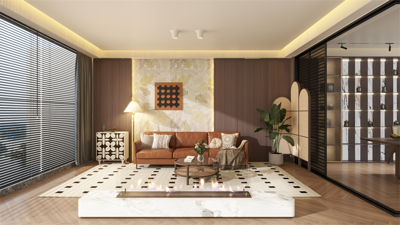 沙发背景墙深色沉稳的“棕忆木”,展现出经典的复古基调,树叶造型的3D打印画加持,给空间注入灵动的自然之美,勾勒出属于家的复古电影艺术感。