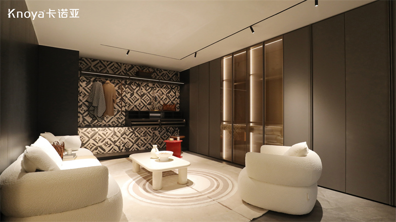 衣帽间空间,采用卡诺亚新品雅奢风格星雨系列,演绎高端人居雅奢生活,沉浸享受精智空间,畅享居家仪式感,将生活舒适与当代美学完美融合。