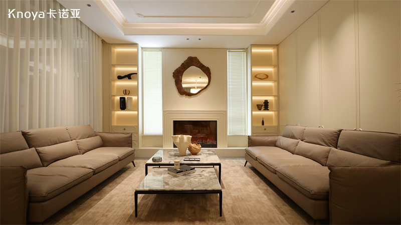 客厅空间,采用卡诺亚新品轻法式风格尔漫系列,勾勒温柔、舒适的慵懒氛围又不失优雅格调。