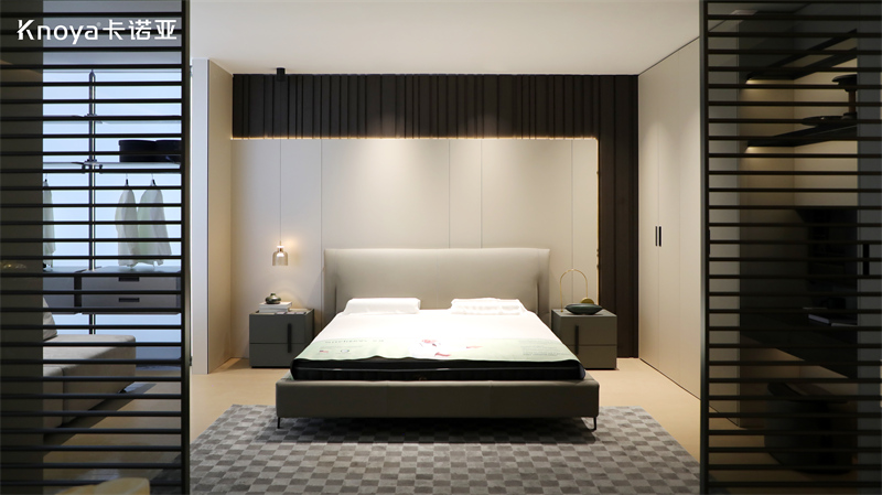 卧室空间,采用卡诺亚新品极简风格览境系列,以柜墙门一体化设计搭配更多功能系统,打造符合生活偏好与美学的“卧室系统”,汲取卧室系统“闲忙享乐学”生活方式灵感。