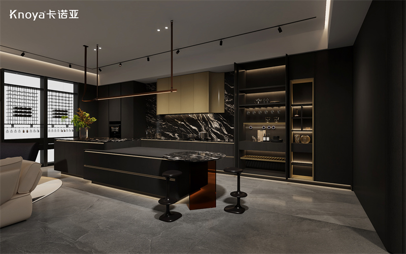 入户、客厅、厨房空间,采用卡诺亚新品极简风格木韵系列,黑色与金色的奢雅搭配,柔和的木纹肌理与线条营造浓郁的意式韵味。