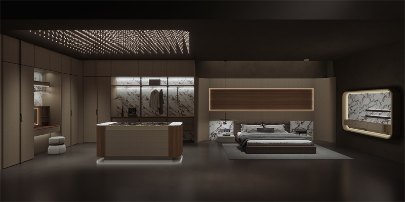 灵感源于“藏物之雅,玉之恒久”,藏玉系列以新中式为魂,通过“形、质、气、韵、神”五重境界,打造步移景异的叙事空间。天然胡桃木皮与数码打印石纹的碰撞,原创品牌LOGO拉手与倒R角工艺的巧妙结合,为35-55岁企业高管精英构建了一个礼序雅境。金属雕刻冲孔板、格栅板勾勒光影韵律,透光弯曲板演绎虚实意境,在这样的设计下,居者于归家礼仪中重拾精神栖居的诗意。