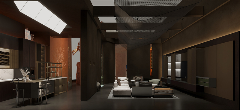 卡诺亚轻高定展馆以洞穴为原型,通过天然岩石门廊、枯枝装置艺术与层叠光影,营造神秘而治愈的探索场域。曲面墙体模拟地质肌理,隐藏式灯光系统仿若天光倾泻,参观动线暗合“发现-沉浸-共鸣”的情感逻辑。在这里,产品不再是孤立展品,而是与空间共生的美学符号、与生活方式的场景合拍,观众将在移步换景中感受“回归自然,重塑空间”的品牌哲思。