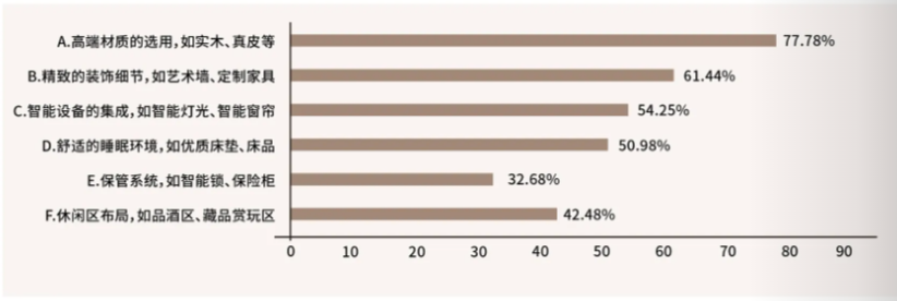 《中国卧室生活方式洞察报告》显示,卧室生活占据人生至少三分之一的时间,其舒适度和功能性对提升生活质量至关重要,不同人群对于卧室生活的需求是不一样的。在打造高品质卧室方面,高净值人群尤其注重高端材质的选用、精致的装饰细节以及智能化设备的应用。具体来看,77.78%的受访者认为高端材质不可或缺,61.44%的人认为精致细节同样重要。