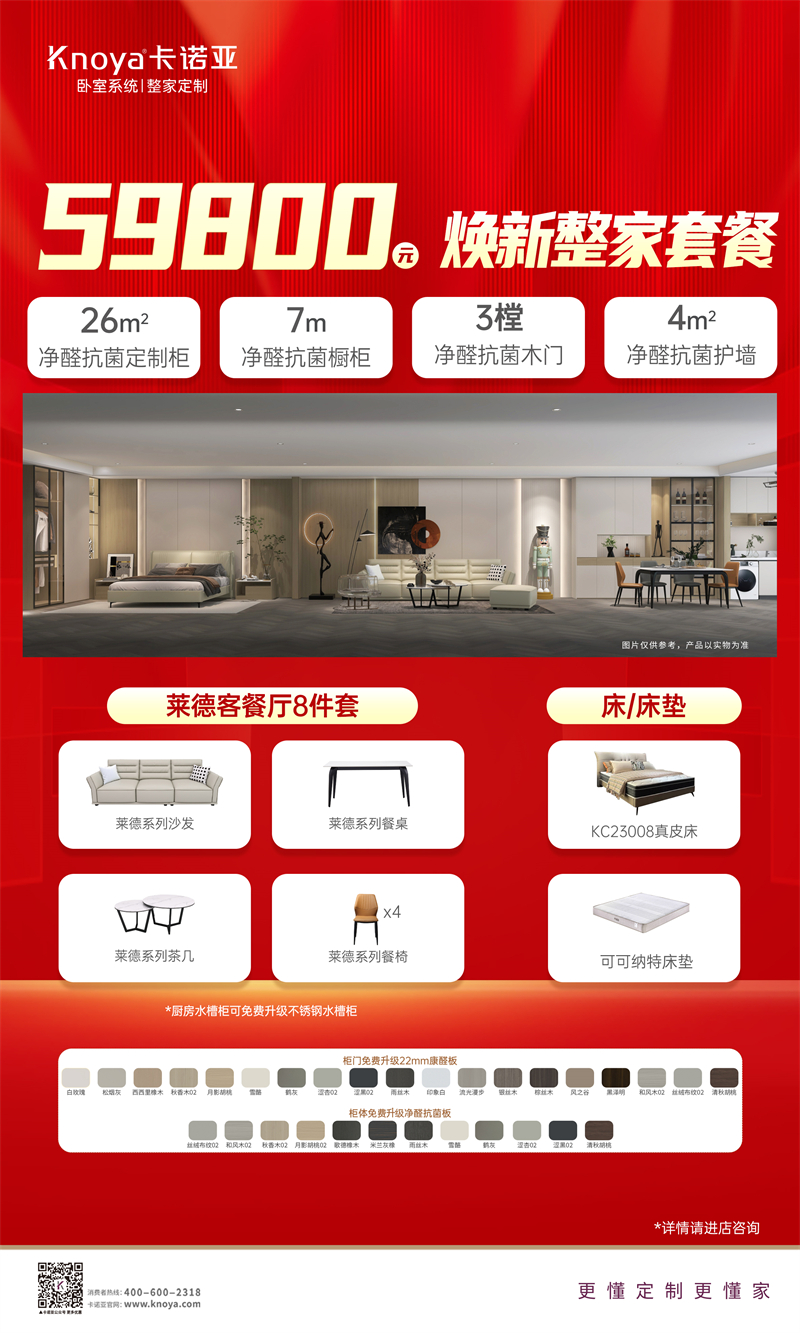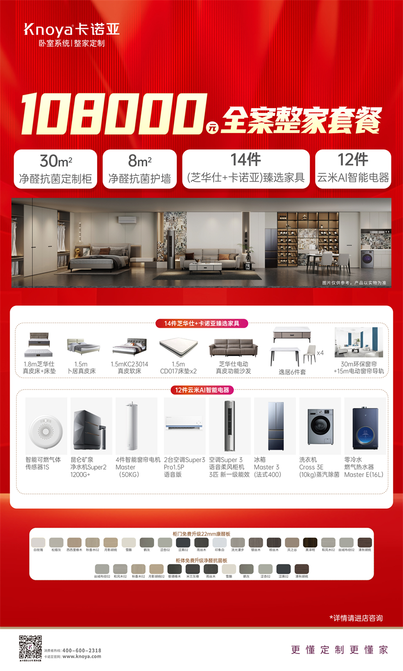 品质生活,从卧室开始。本次活动,卡诺亚携手芝华仕、CBD、云米科技等多个知名品牌,倾情推出32800元忙在卧室套餐、28800元享在卧室套餐、24800元学在卧室套餐等,整合卧室系统app+高端整家配套,包含app柜、护墙板、家具家品及智能家电,一站式打造舒适睡眠、智能便捷、格调美学、高效收纳兼备的品质休憩空间。