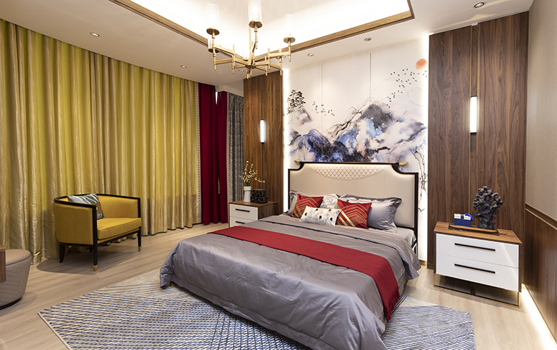 卡诺亚丨东方雅阁·卧房采用隔断柜隔开主卧和衣帽间功能区,相对独立、互不干扰,一边是全身试衣镜,一边是梳妆台,中式屏风点缀,让隔断柜成为卧房一道靓丽的风景线。欧式墙裙、中式卧榻、床头3D中式山水装饰画、皇家黄与中国红搭配的窗帘、对称均衡的设计,让卧房别具东方人文气质。