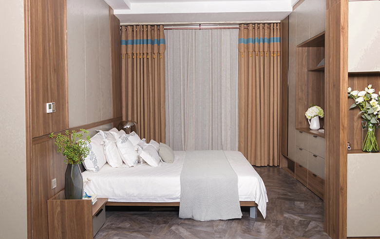 卡诺亚丨都市闲情·卧房开启繁忙的都市生活,从睡一个好觉开始!大面积的护墙系统使用,冬暖夏凉、吸音减噪、防潮吸湿。运用时尚竖纹线条,护墙系统与墙等宽色块设计,让人备受呵护,更具安全感。深色木纹与浅灰搭配使用,宁静的色调中赋予卧房别样的静谧。