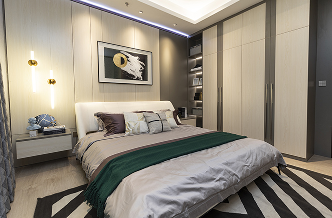 大面积运用橄榄木+高原雪橡/印象白的撞色搭配,给人明朗、活泼、自然之感。橄榄木护墙系统,隔音防潮,营造舒适睡眠空间。嵌入式衣柜及推拉门设计,不占用空间,将简洁风格发挥到极致。